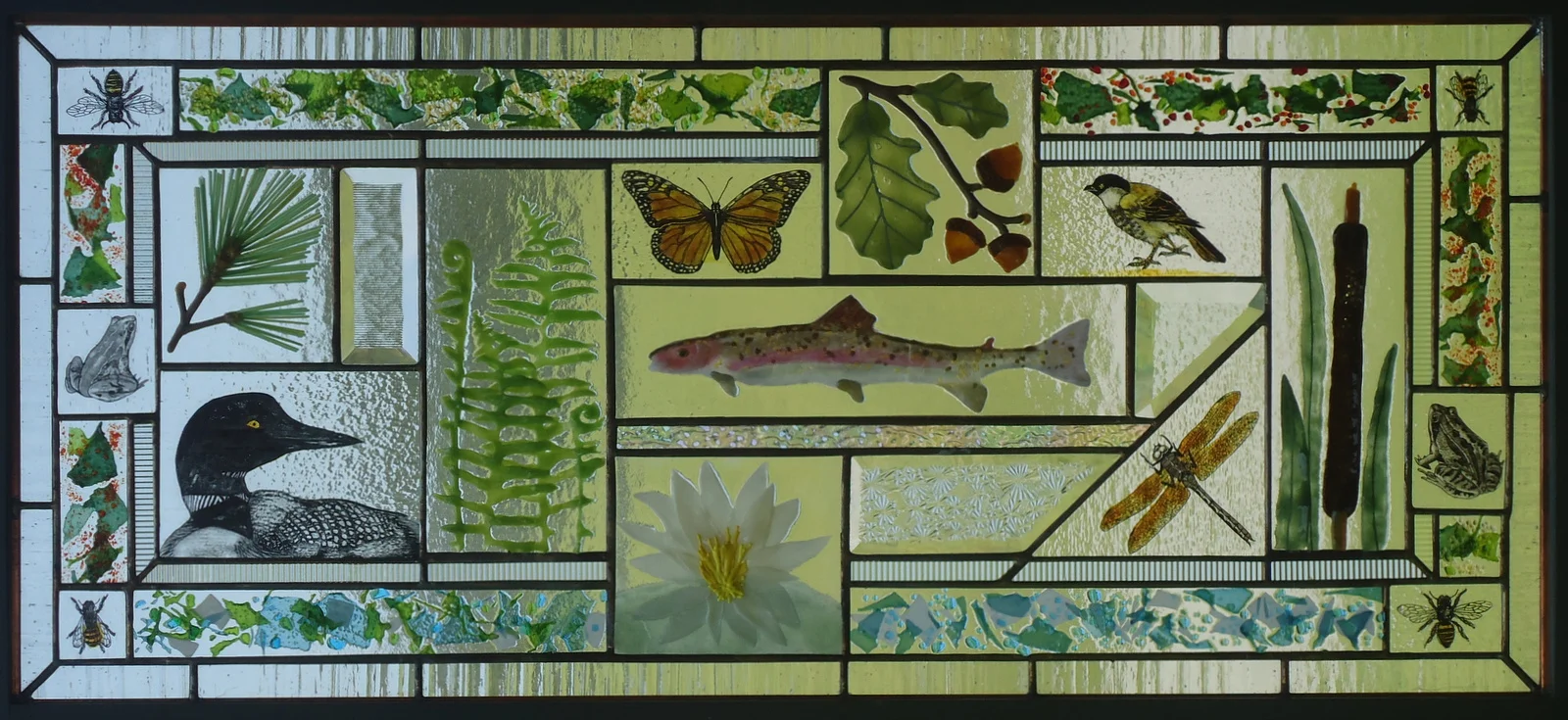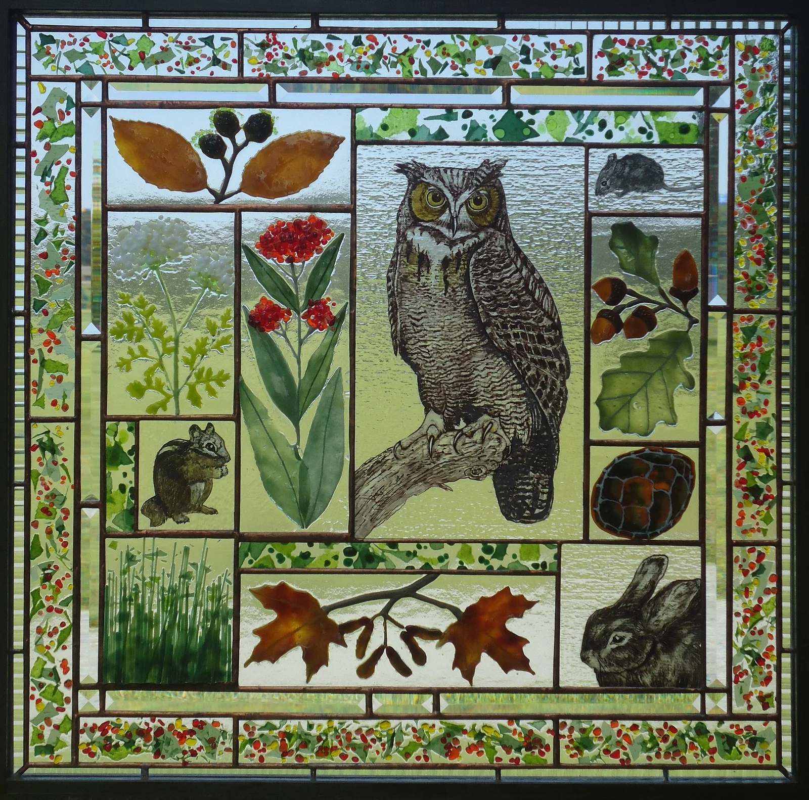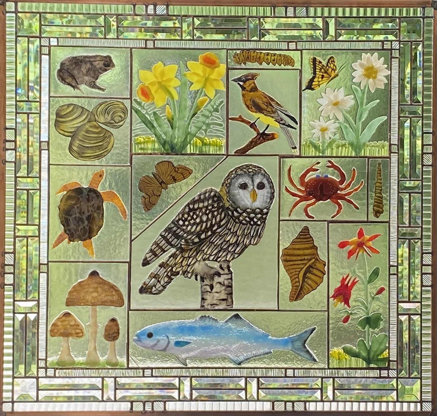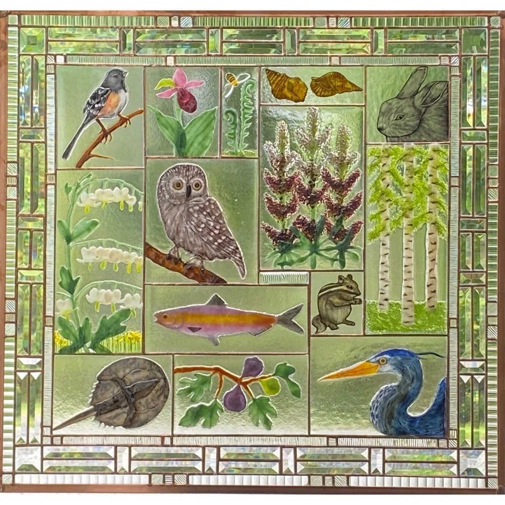 This series combines four difficult and disparate glass techniques to create these signature fine art glass panels: fusing, hand-painting, traditional stained glass construction, and hand beveling. This latest series features flora, created by fusing, fauna rendered in the technique of medieval hand-painting, and leading. The resulting panels create a stunning story that is enhanced by the tension between the colorful fused flower elements and the finely detailed hand-painted animal images, and delicate hand bevels – a patchwork of glass that captures one’s imagination just as it captures the light that passes through it.
